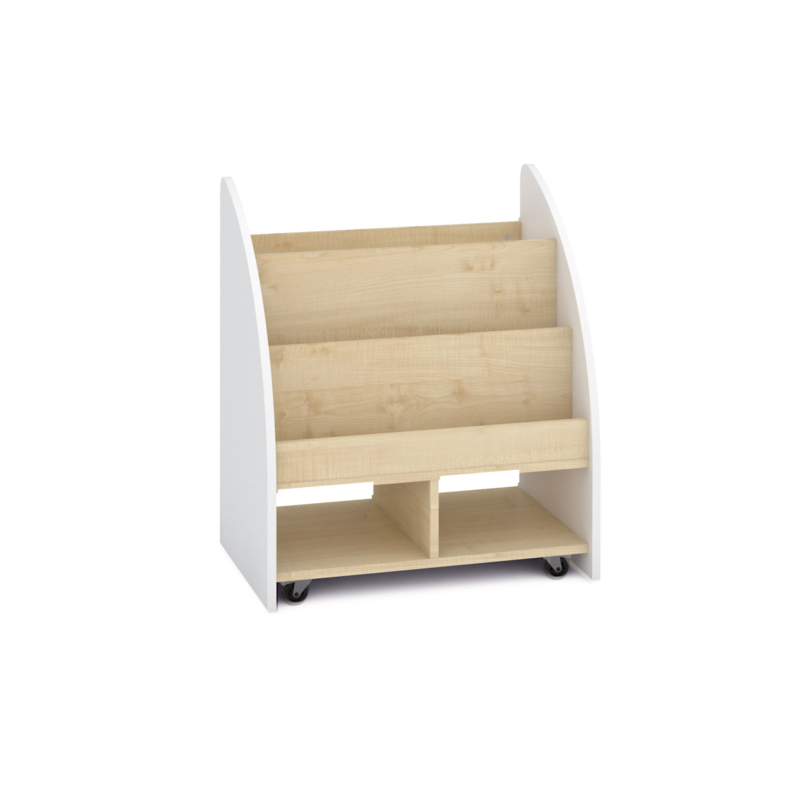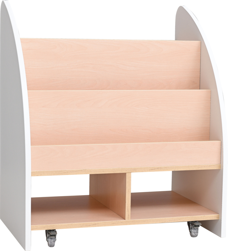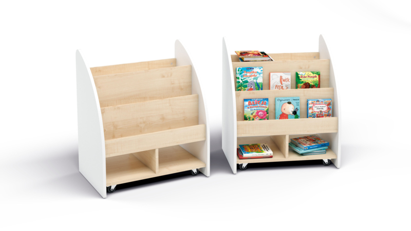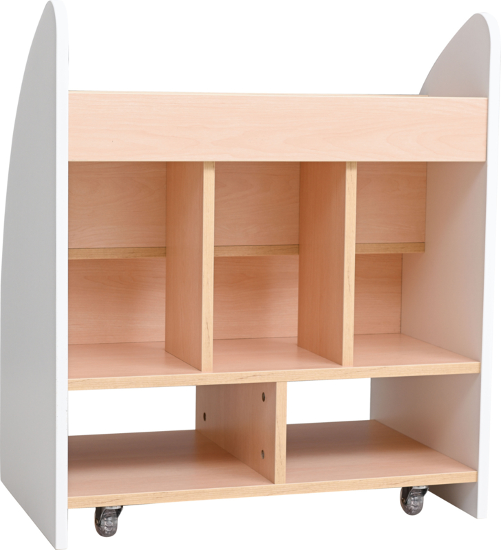 OverzichtEen mobiele en ruime dubbelzijdige boekenkast. Met planken voor (bijvoorbeeld) het tentoonstellen van boeken of knutselspullen aan de ene kant en vakken voor spelletjes en grotere boeken aan de andere kant.