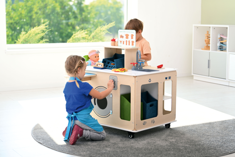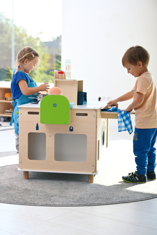 Rond dit keukeneiland kan alles en meerdere kinderen kunnen (gelijktijdig) koken, afwassen, strijken en nog veel meer