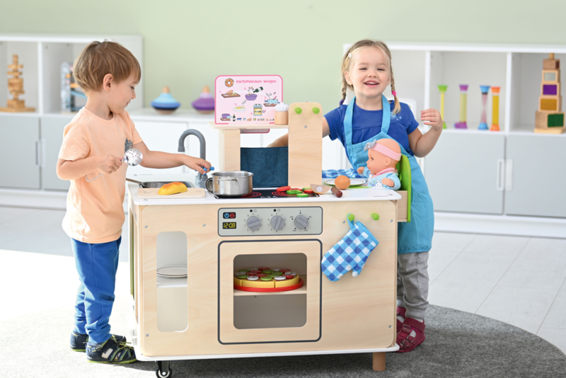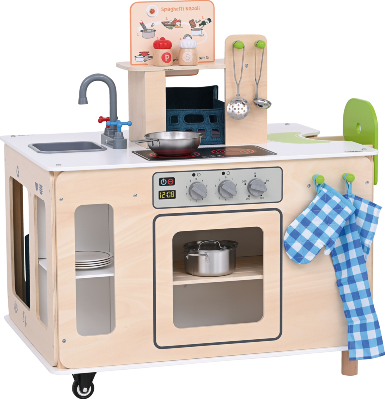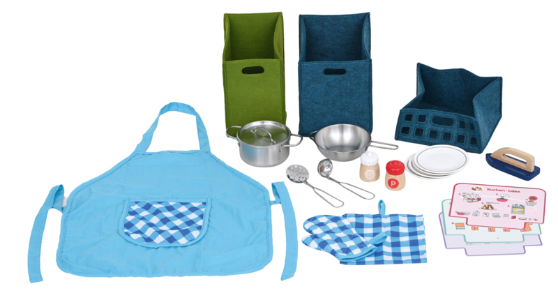 Inclusief verschillende accessoires: 3 receptenkaarten, 3 wastips, 1 schort, 1 ovenwant, 1 theedoek, 1 wasmand, 1 strijkijzer, 1 pan, 1 koekenpan, 1 soeplepel met vergiet, 1 soeplepel, 4 borden, zout- en peperstrooiers en 2 vilten prullenbakjes