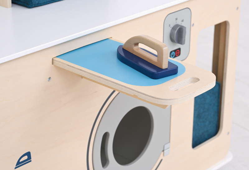 De uitschuifbare kinderstoel biedt de pop een plekje om te zitten en toe te kijken hoe haar vader of moeder strijkt