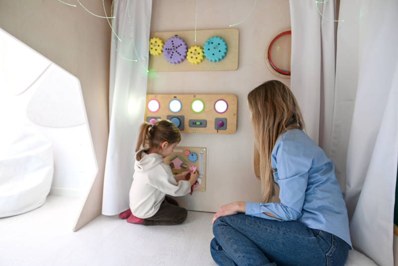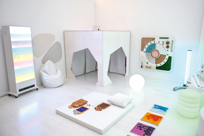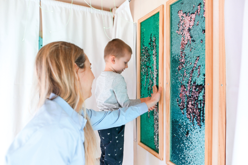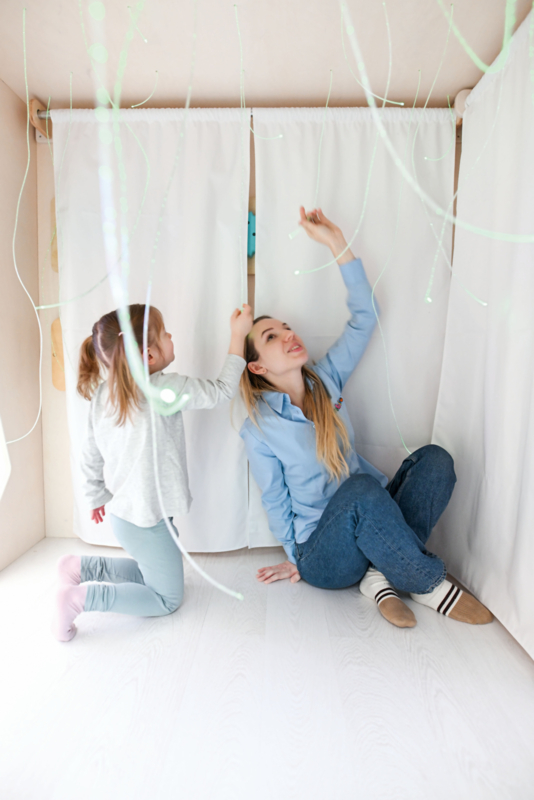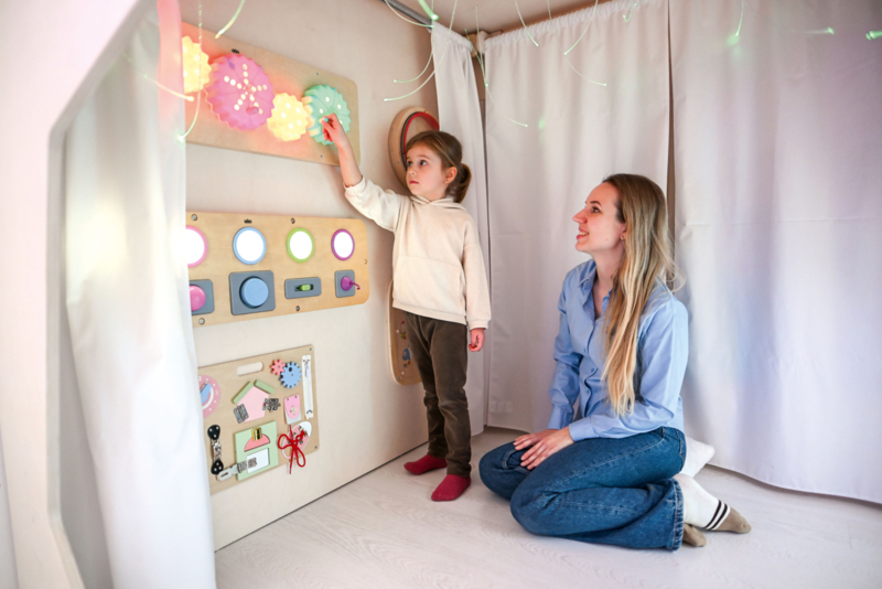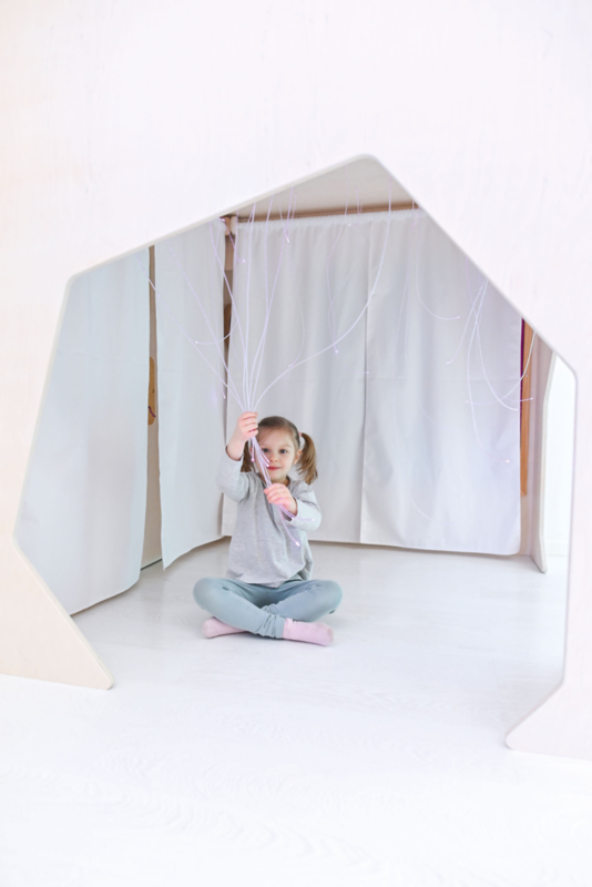 Een bijzondere ruimte die kinderen uitnodigt om te spelen en tegelijkertijd te ontspannen. Het speelhuisje heeft twee opvallende ingangen die naar behoefte met gordijnen kunnen worden afgesloten. Twee wanden zijn voorzien van kleurrijke, interactieve elementen zoals sensorische borden, acrylspiegels en meer. De gordijnen zijn bevestigd aan roeden en bedekken, wanneer ze gesloten zijn, gedeeltelijk de interactieve elementen, waardoor een beschutte ruimte ontstaat waar kinderen zich kunnen terugtrekken van de sensorische overbelasting.
