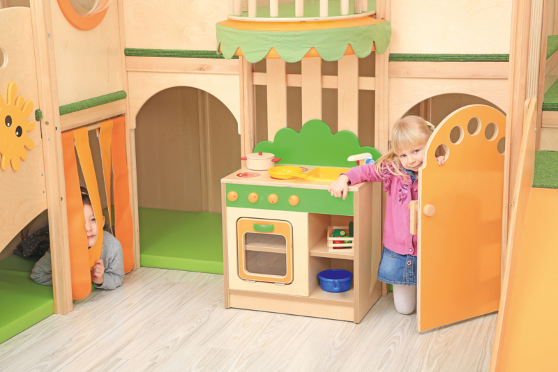 Verder is er een fornuis met gootsteen en 3 (interactiev) activiteitenborden