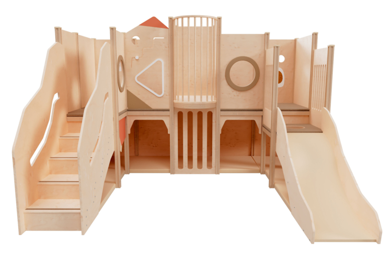Verschillende ingangen leiden naar de ruimte onder de platforms. Hier is ruimte om te spelen, je te verstoppen of te rusten. De matrassen zijn zacht en knuffelbaar. De lichte, warme kleuren creëren een aangename sfeer. De speelruimte omvat een glijbaan, een trap, een balkon, patrijspoorten en ramen, en diverse matrassen. Een bijzonder hoogtepunt is het glazen raam in het platform boven de glijbaan, waardoor je naar beneden kunt kijken.