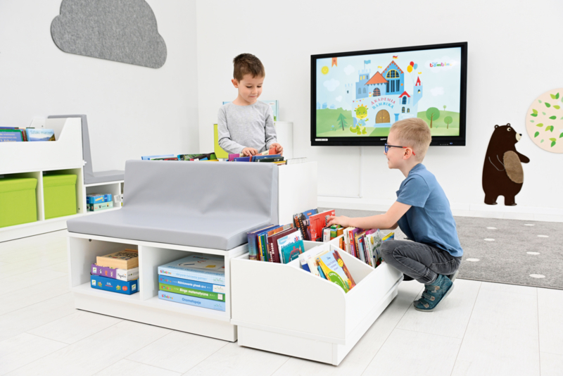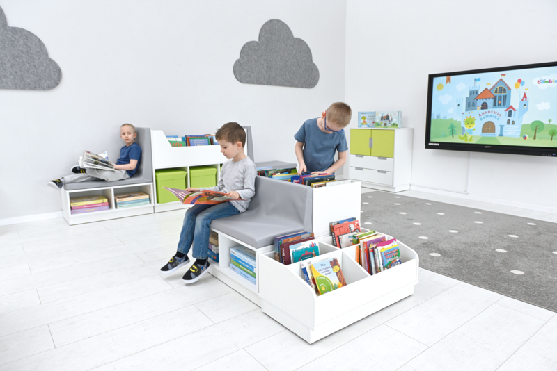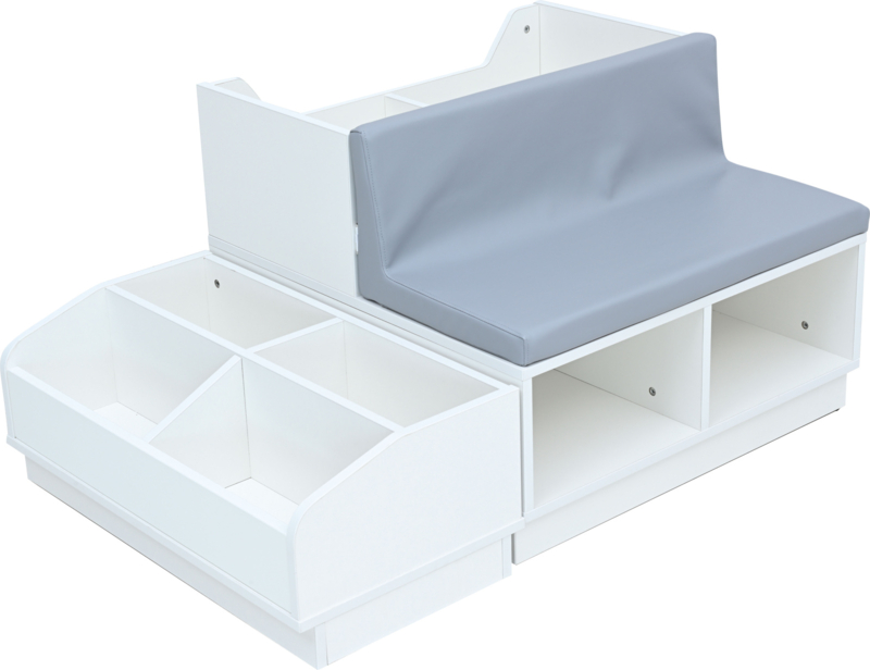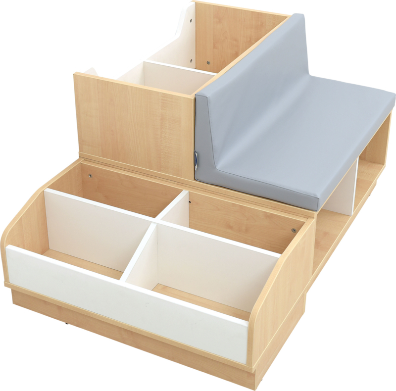 Aan één zijde zijn er meerdere grote vakken voor boeken en eventueel 2 opbergboxen, aan de andere zijde een zacht leesbankje van 5 cm dik foam met onderhoudsvrij (kunst)leer