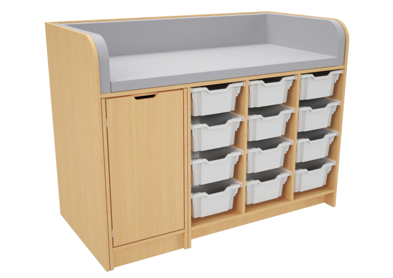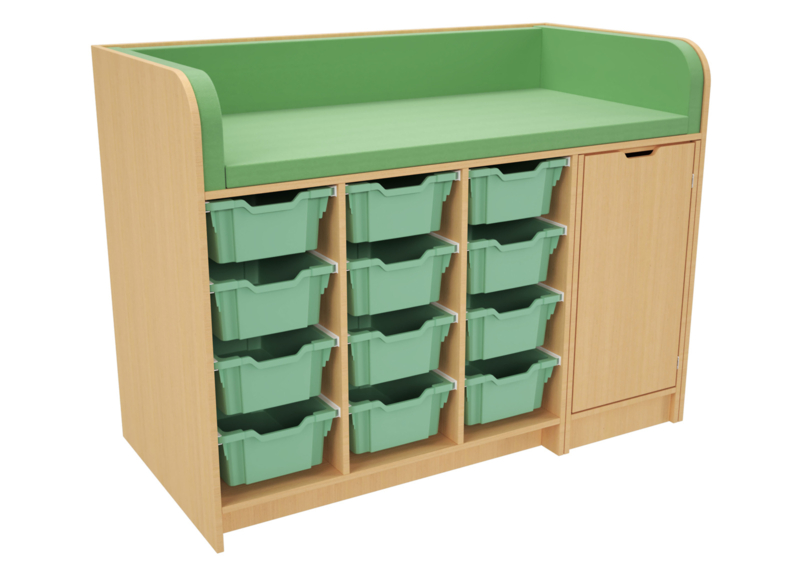 Blauw, grijs of groen aankleedkussen is gemaakt van foam 6 cm dik met (kuns)tleer (meegeleverd en als vervangend kussen verkrijgbaar op aanvraag)